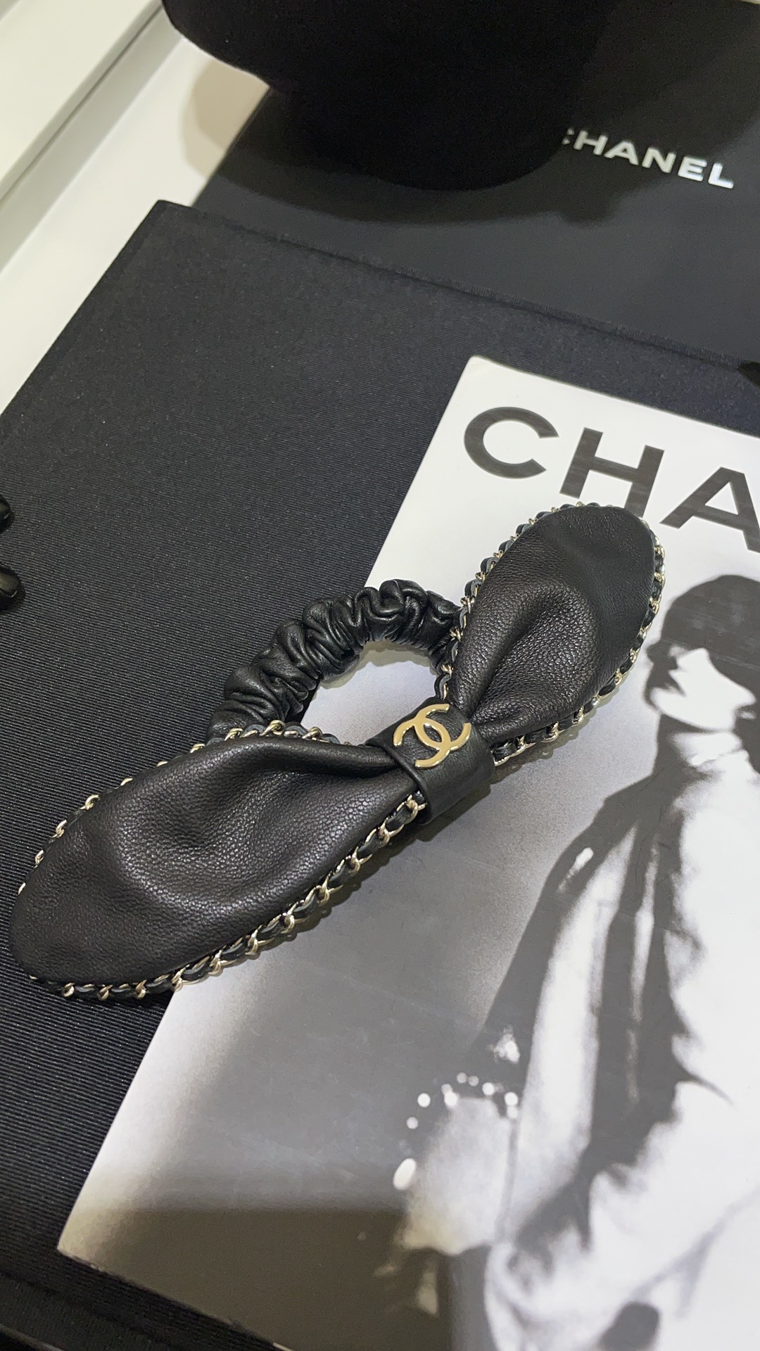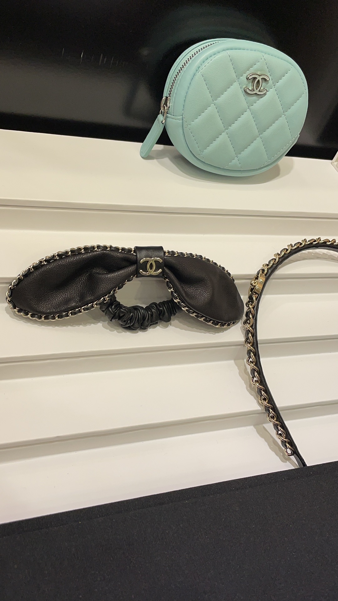 Introducing our newest arrival - the 22 Series Hair Band featuring black lambskin with chain double C bunny ears design. This stylish scrunchy combines fashion and functionality for a unique accessory.