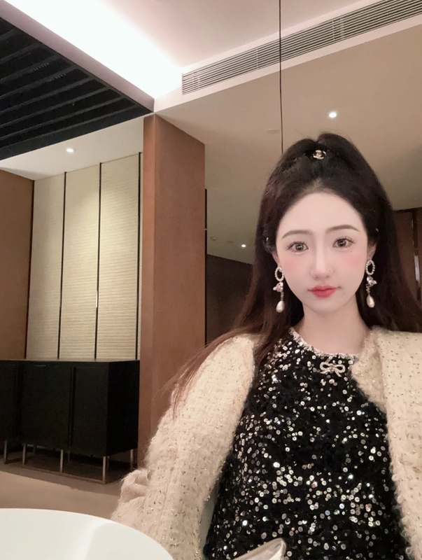 ไข่มุกทรงหยดน้ำห้อยลงมาอย่างสง่างามตามแนวข้างใบหน้า สร้างเอฟเฟกต์ที่ดูเรียวและมีชีวิตชีวา