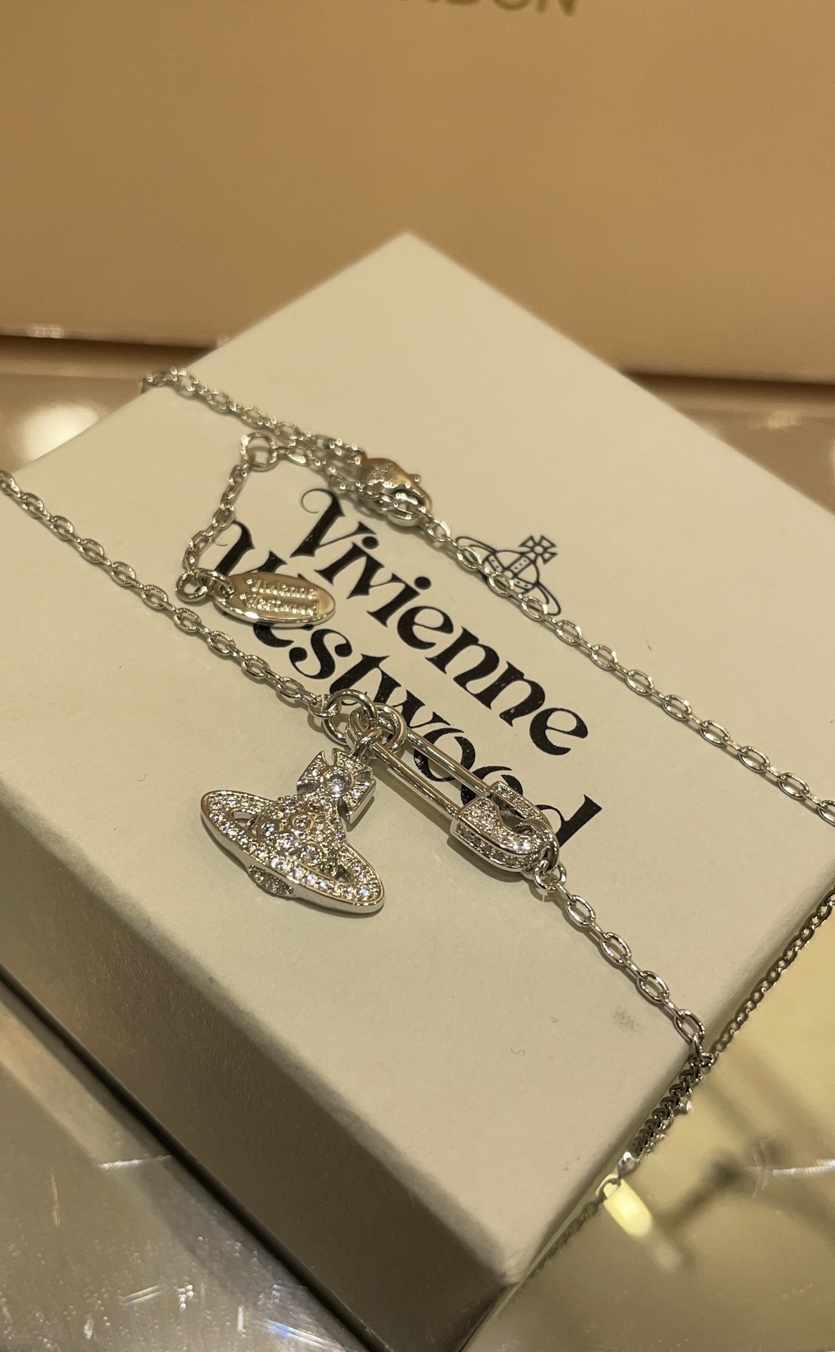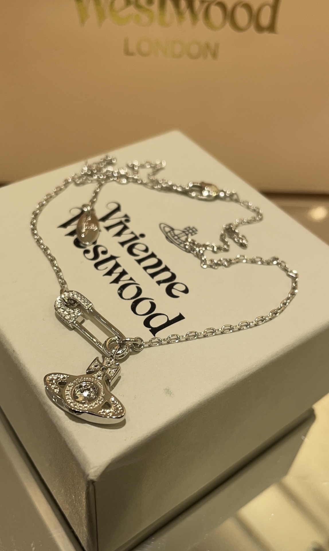 Chain Clause Saturn Pin Pendant featuring the iconic Vivienn* Westwod design with genuine Swarovsk* crystals.